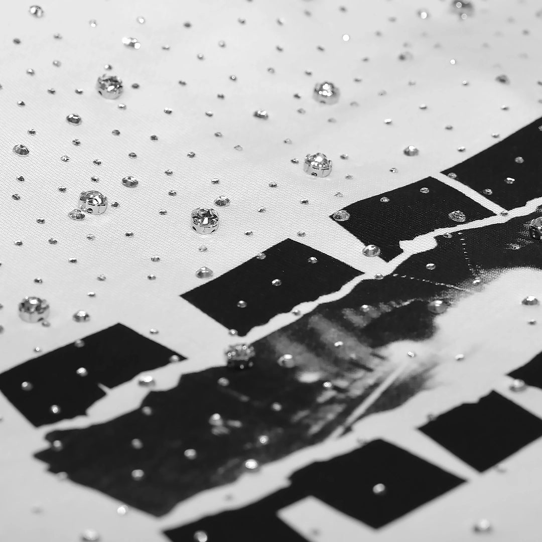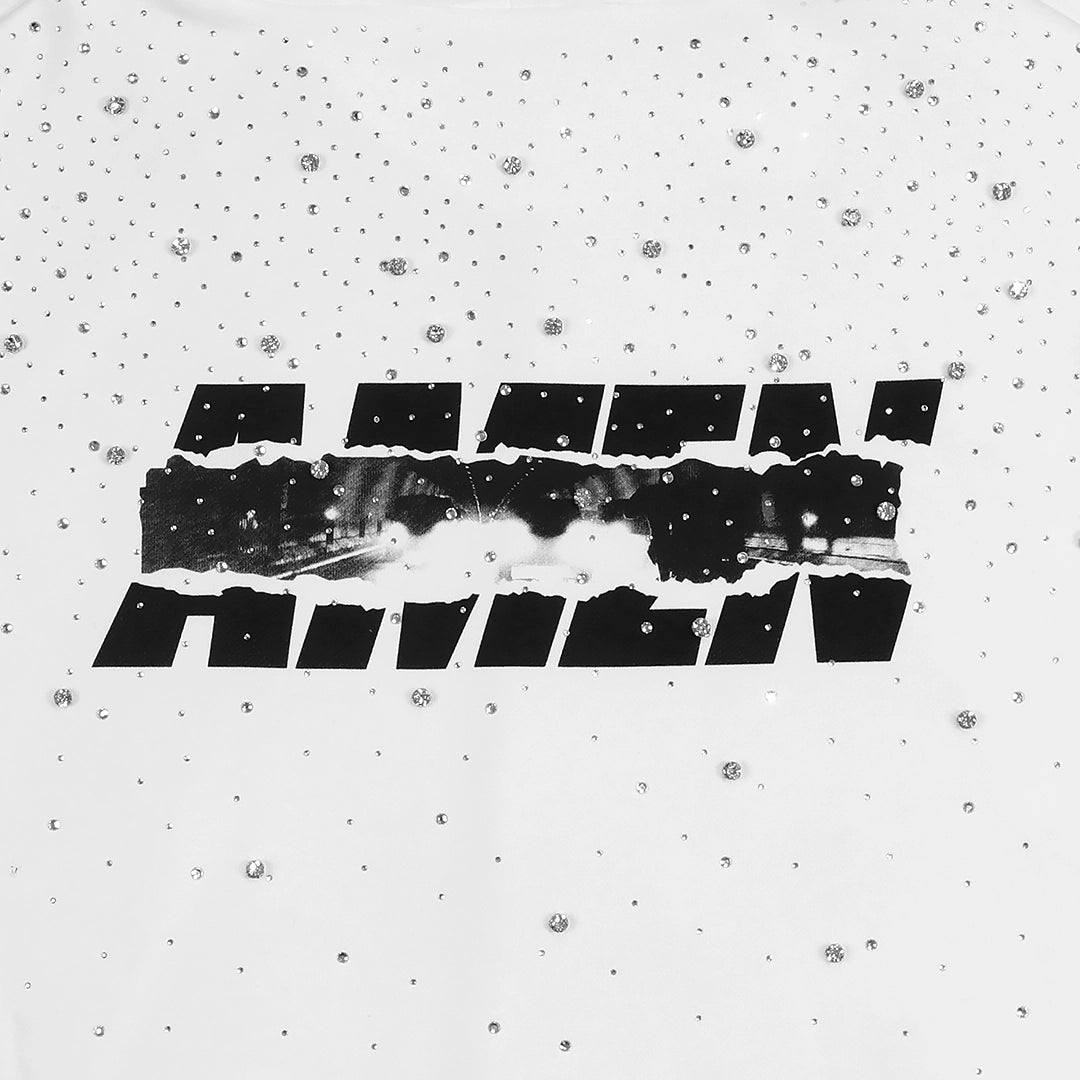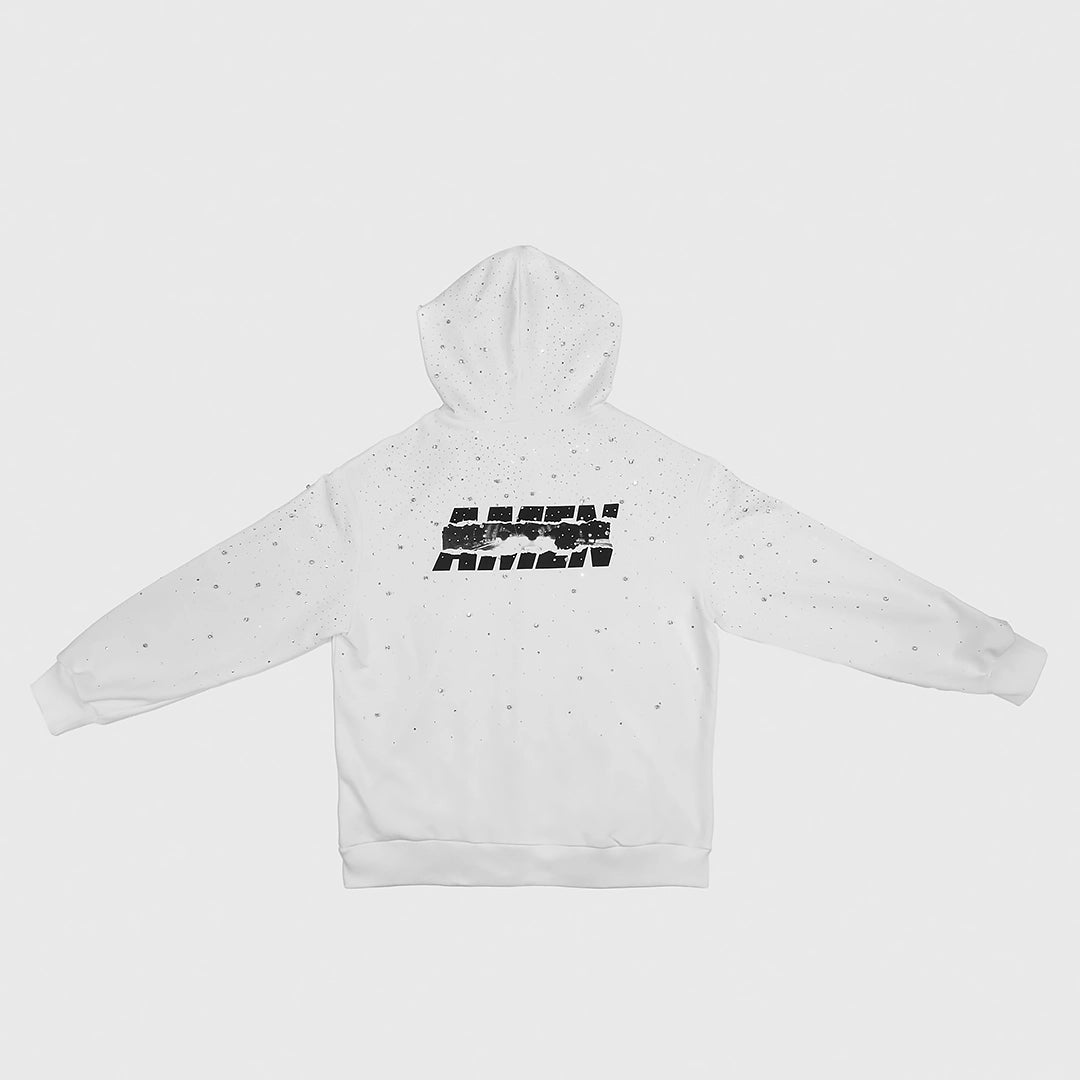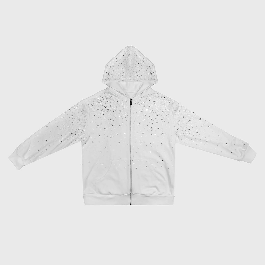 Felpa bianca unisex full-zip con cappuccio in cotone, arricchita da strass applicati all-over che creano un effetto luminoso e ricercato su tutto il capo.
