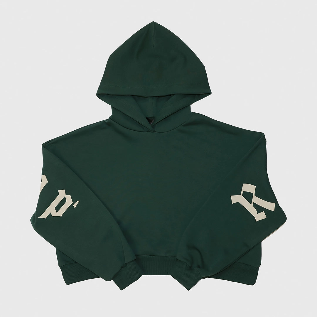 Completo donna in cotone verde composto da felpa cropp con cappuccio e pantalone jogger coordinato.
