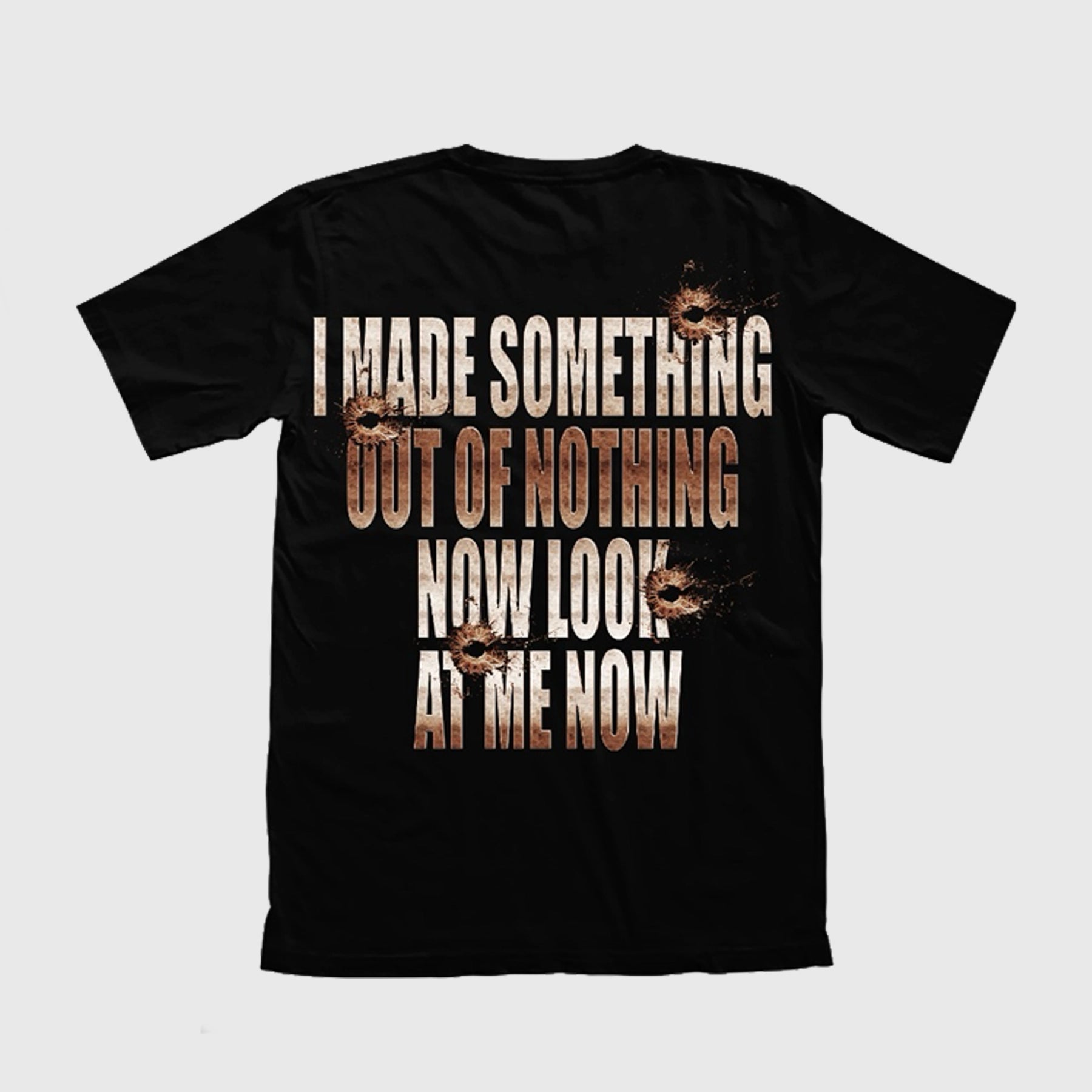 T-shirt con titolo della canzone e auto Phantom stampate sul fronte, e frase “I made something out of nothing, now look at me now” stampata sul retro.